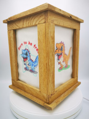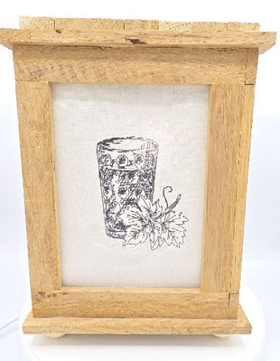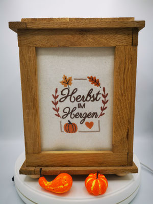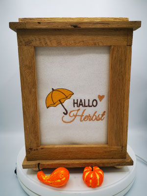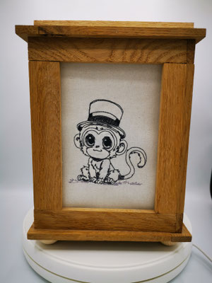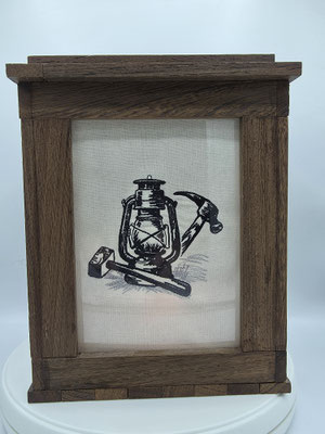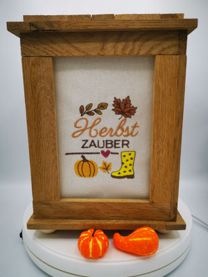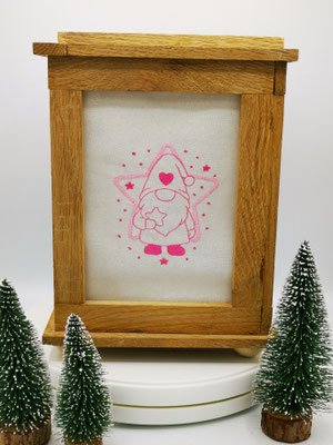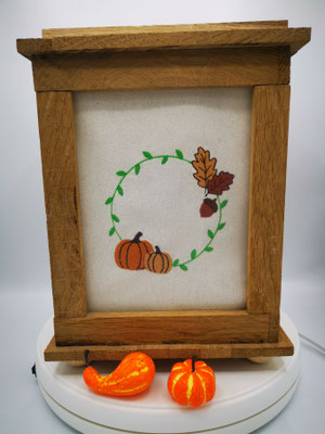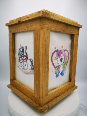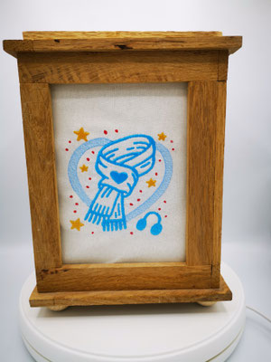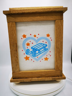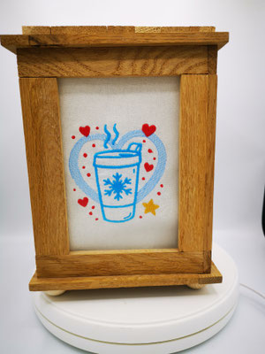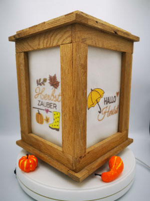Die Seitenteile sind mit 4 tollen Motiven bestickt. Der Stoff wurde zum Schutz auf Mobilefolie fixiert und wird von innen in der Laterne befestigt.